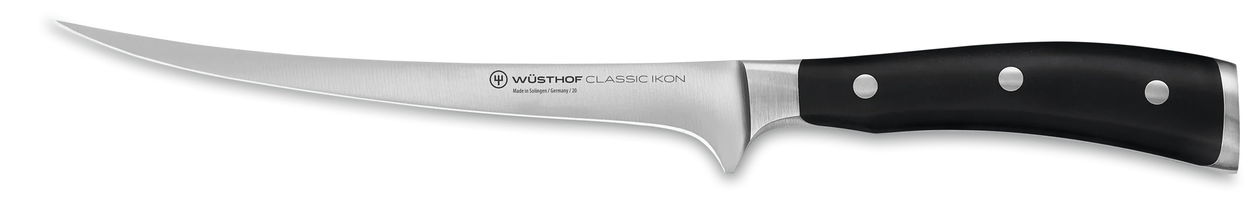 The Wusthof Classic Ikon 7 inch fillet knife has a very thin flexible blade used for deboning and filleting fish. It includes a leather sheath for storage and protection. The long narrow blade of the fillet knife allows you to move smoothly along the backbone of the fish and easily remove the skin. The Wusthof Classic Ikon collection features a handle with an elegant shape and comfortable grip, as well as a double bolster for heft and balance.